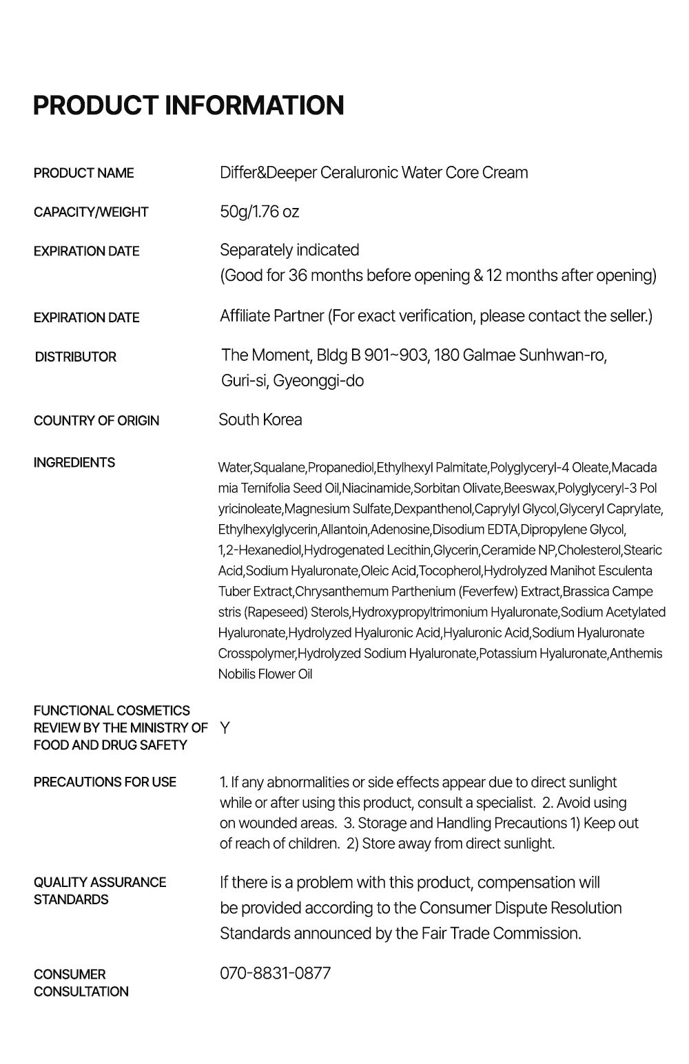 CPNP_DIFFER&DEEPER Ceraluronic Water Core Cream, Cosmetic Unique synergistic ingredients