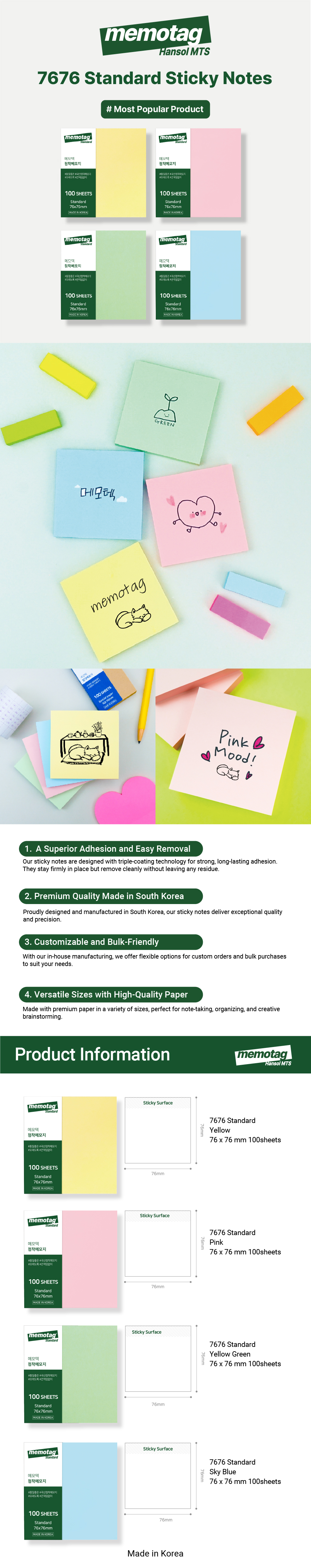 Memotag is a flagship brand of HansolMTS and the only adhesive sticky note brand in Korea that independently manufactures its own adhesives, processes, and produces the finished products.