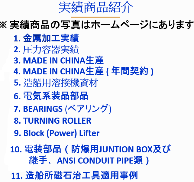 Our company specializes in exporting steel, shipbuilding welding materials, parts, and consumables, and focuses on stable supply to Japanese companies.