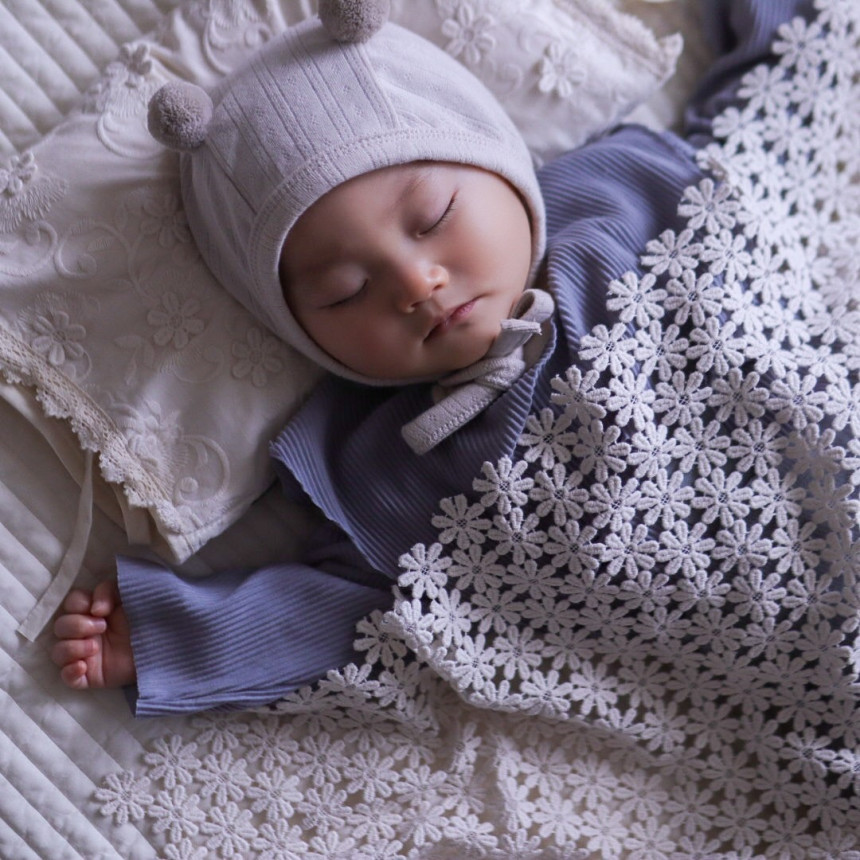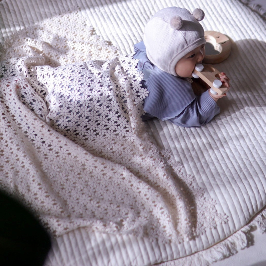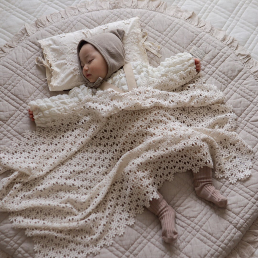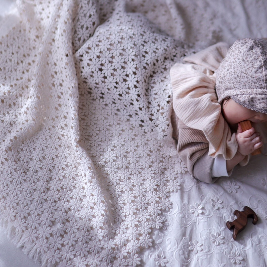 Delicate, petal-shaped crochet work paired with a soft, gentle fabric creates a warm and comforting feel.